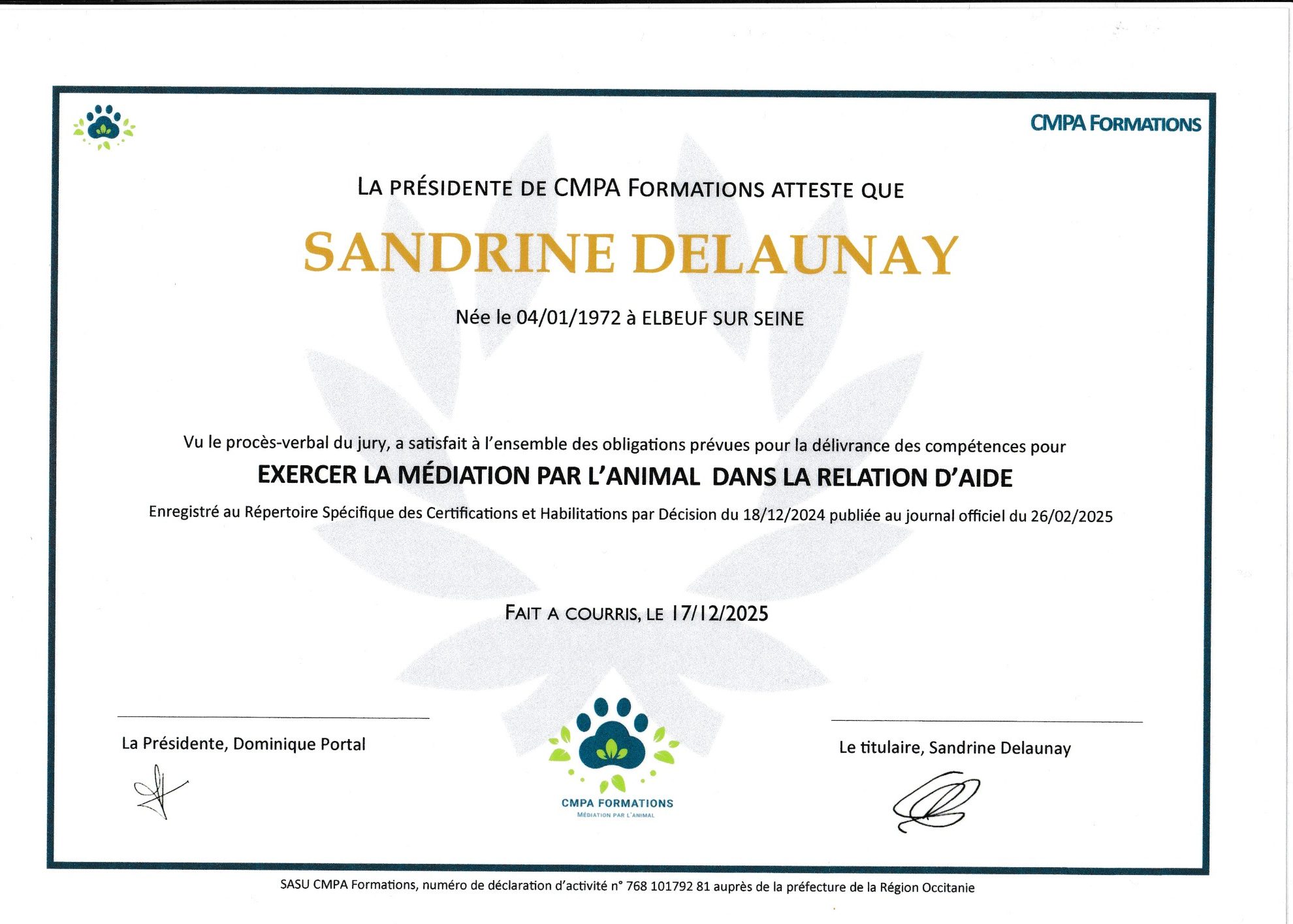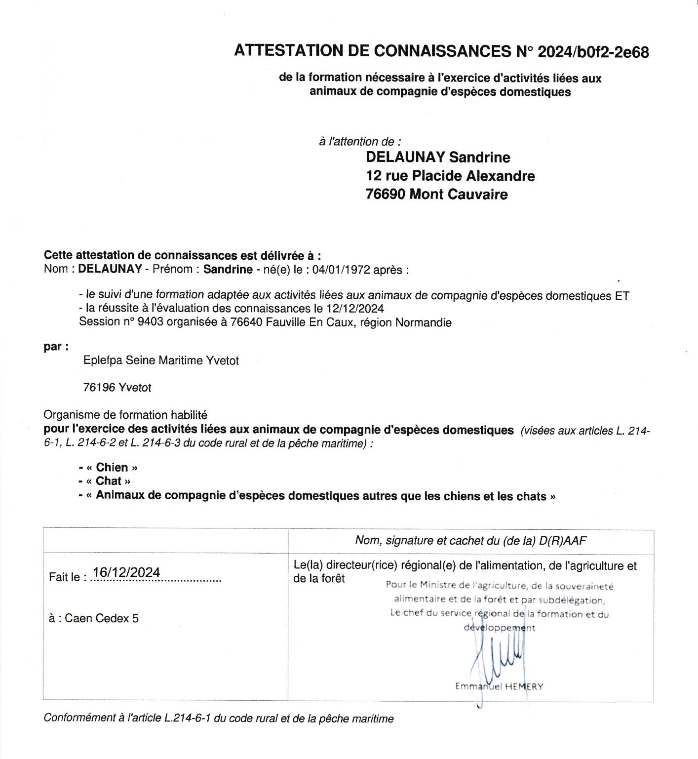 J'ai naturellement eu envie d'allier les animaux à ma pratique de l'accompagnement, c'est pourquoi j'ai passé L'ACACED puis la certification d'intervenant en médiation par l'animal dans la relation d'aide avec CMPA Formation.